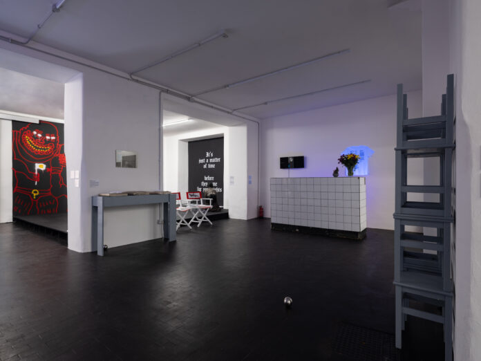Le projet Times Bar, reconstruit à l’intérieur du Basement, incarne l’âme conviviale et relationnelle de la biennale. Né à Berlin entre 2011 et 2014, ce bar réel créé par Calla Henkel et Max Pitegoff a été un lieu de rencontre pour la communauté artistique. À BAAB, le comptoir original est réinstallé et devient à nouveau une scène pour la socialité. Chaque semaine, un artiste réalisera un travail site-specific derrière le comptoir. “Nous aimions l’idée des murs tournants”, explique Marotta, “un flux constant de présences, de travaux, de relations”. À cette dimension éphémère s’ajoute un plan plus symbolique. L’artiste Valentin Noujaïm (1991, France) raconte dans une vidéo l’histoire d’un club underground à la Défense, point de rencontre pour la communauté arabe parisienne, puis fermé.