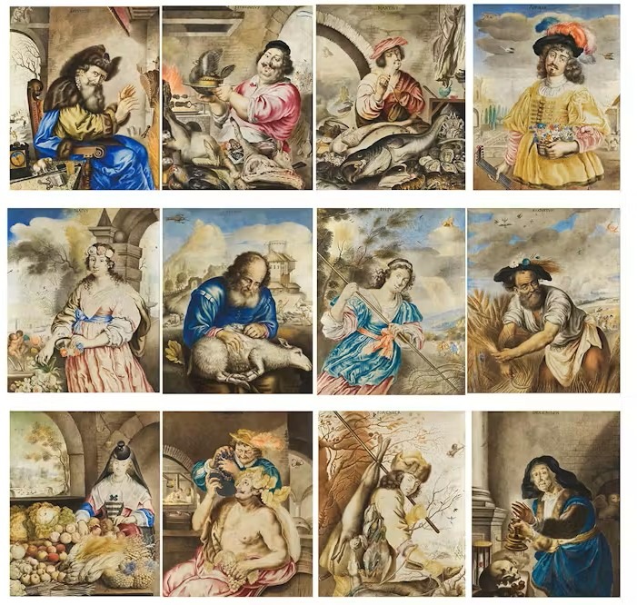 Da Dario Ghio (Montecarlo) potete trovare una splendida serie di dodici Gouache su carta, ognuna raffigurante un mese dell’anno, identificato da iscrizione latina posta nella parte superiore della composizione (IANVARIVS, FEBRVARIVS, MARTIVS, ecc.).
