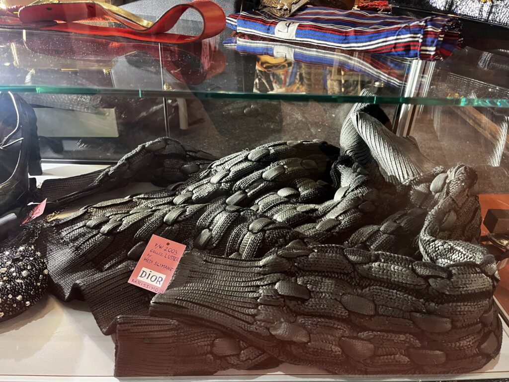 Da Officine Li Volsi siamo attratti da un maglione Dior del 2003 della collezione Luster di Hedi Slimane (molto raro). Non mancano capi curiosi come un soprabito anni Venti e una giacca messicana di fine anni Sessanta estremamente ricercata nella colorazione blu, un cappotto da lavoro degli anni Trenta rilavorato per uso teatrale o cinematografico.